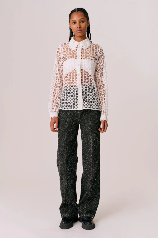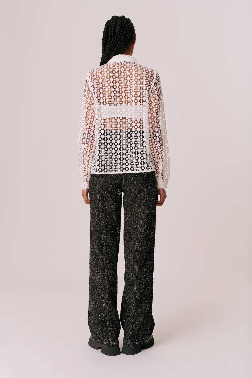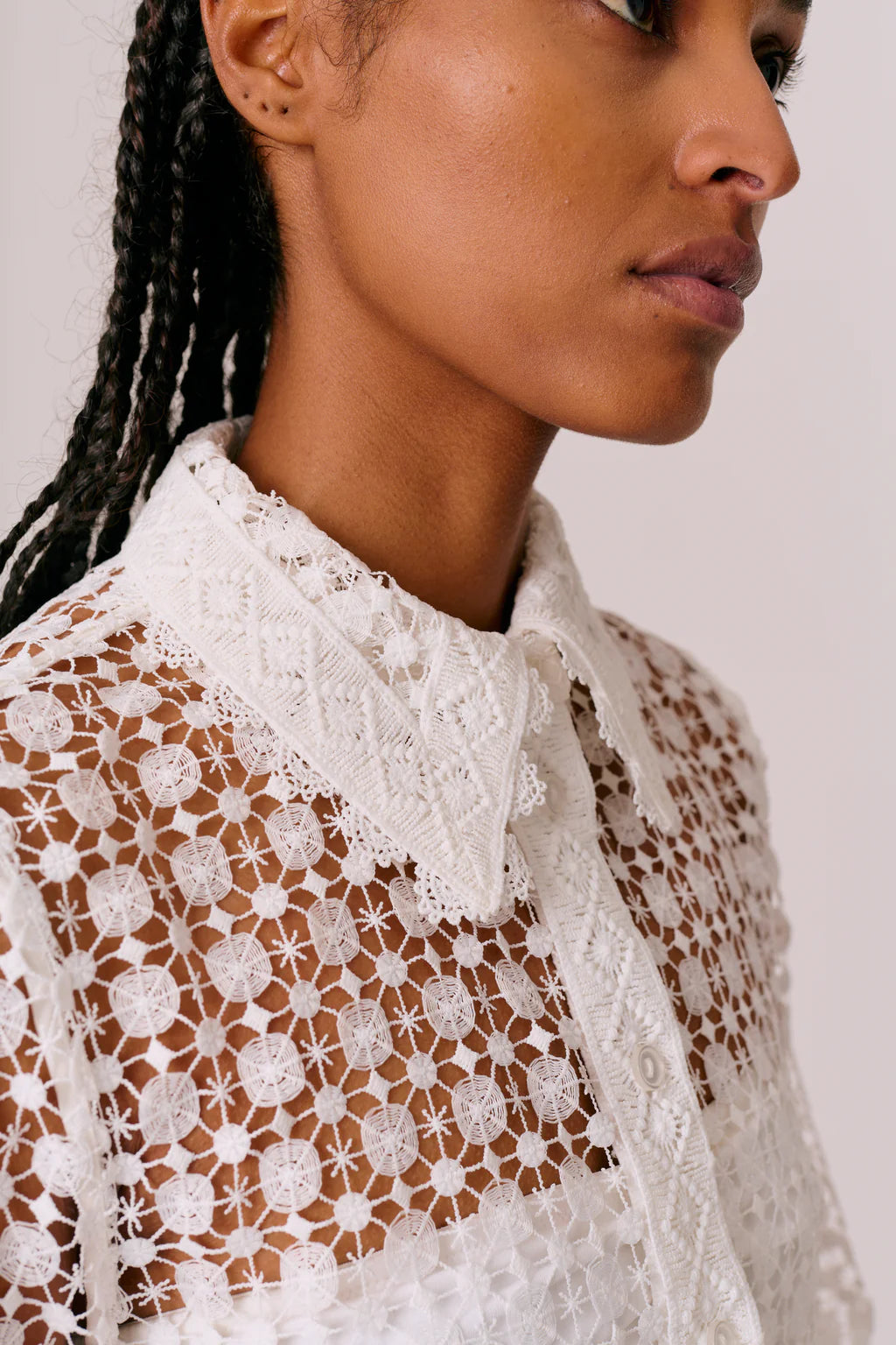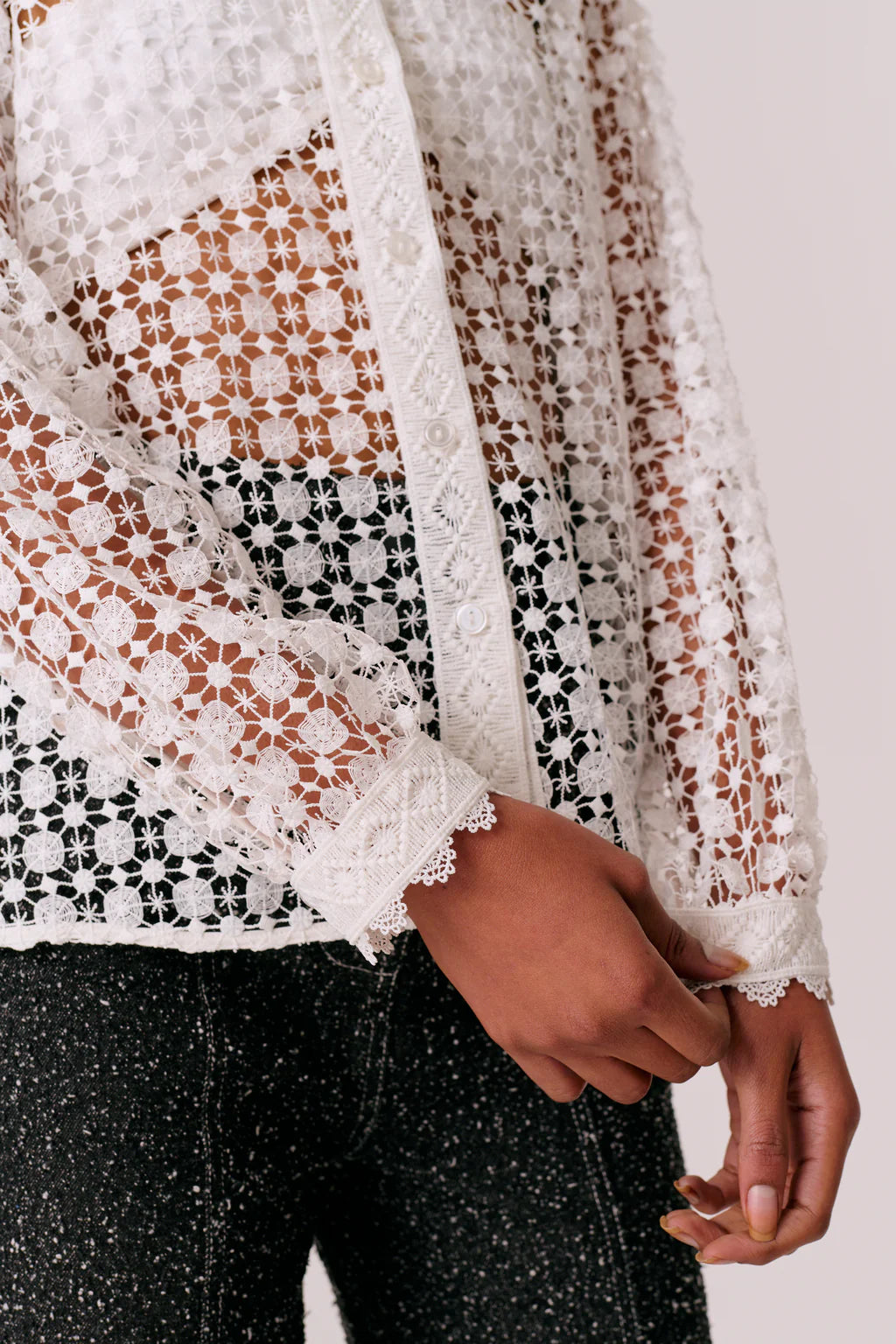 Softly structured yet lightweight, the Arlette Shirt offers an elegant balance between romantic detail and modern transparency.