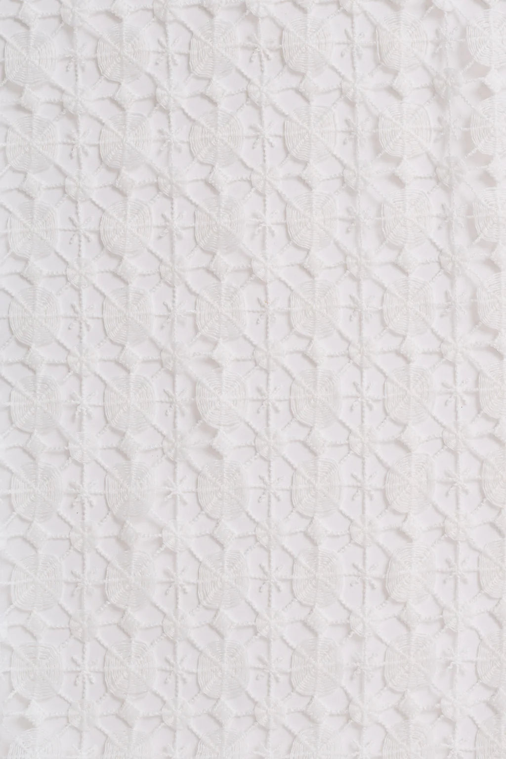 This sheer, long-sleeved shirt is crafted from delicately embroidered fabric with an all-over floral pattern. It features a classic collar, button-down front, and intricate lace trim at the cuffs and hem.