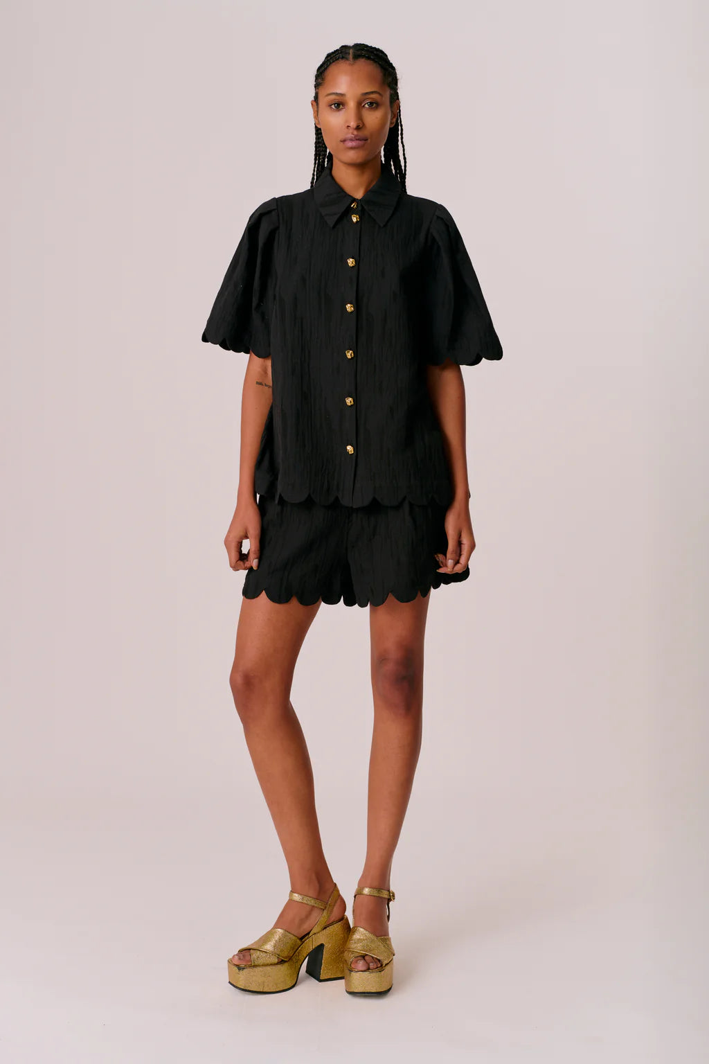This relaxed shirt features a classic collar, short sleeves, and a slight oversize fit for effortless summer dressing. Scallop detailing along the sleeve edges and hem adds a soft, feminine finish.