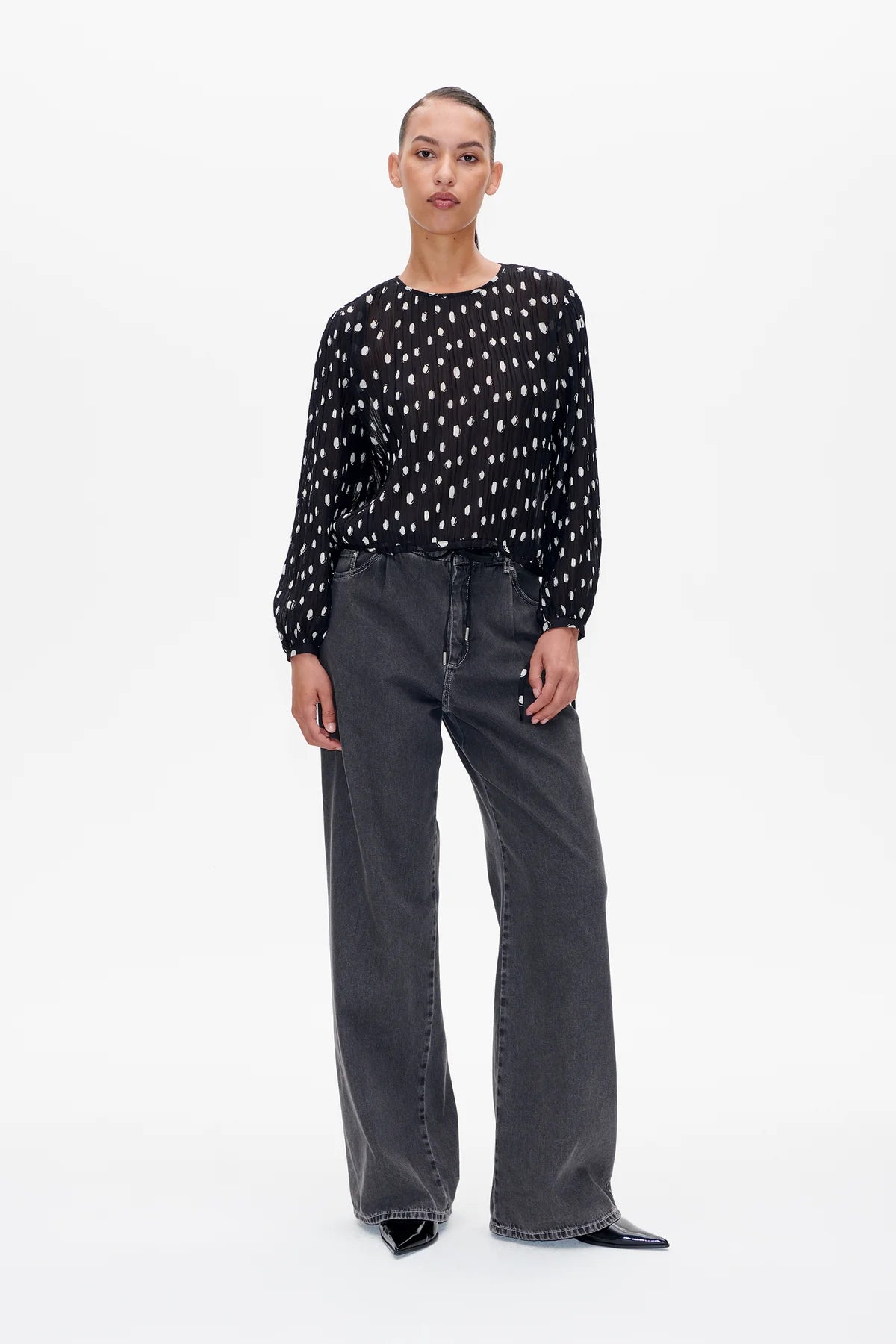 This soft, semi-sheer top features a plissé texture, buttons at the wrists, and a drawstring at the hem. The top is made from recycled polyester.