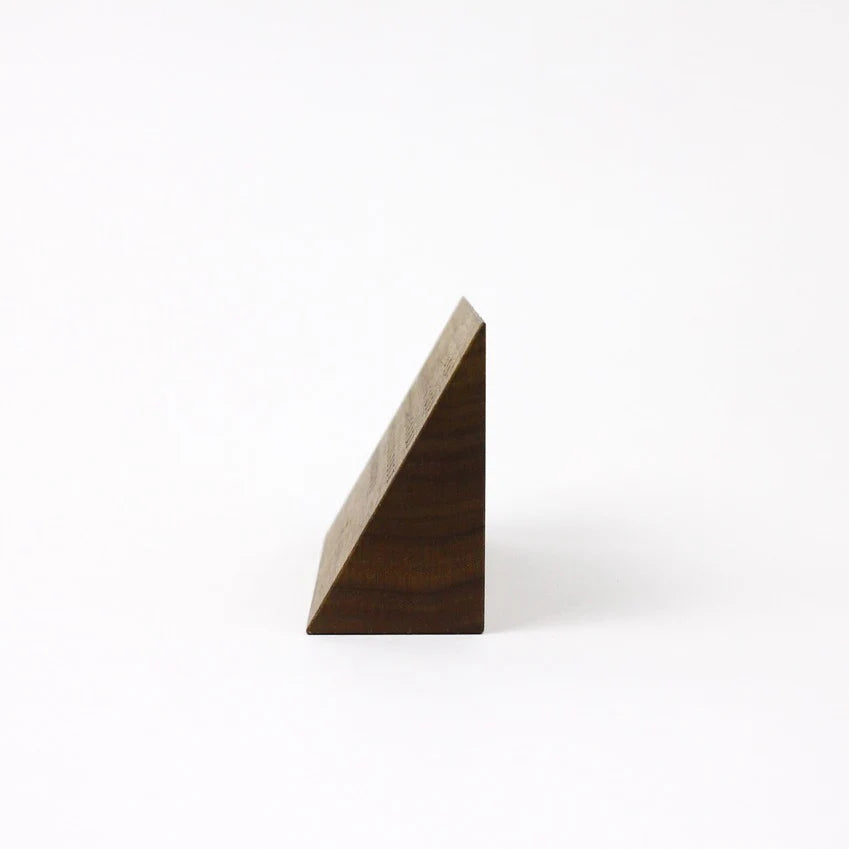 A perpetual calendar that combines a walnut triangular material with a brass hook plate.