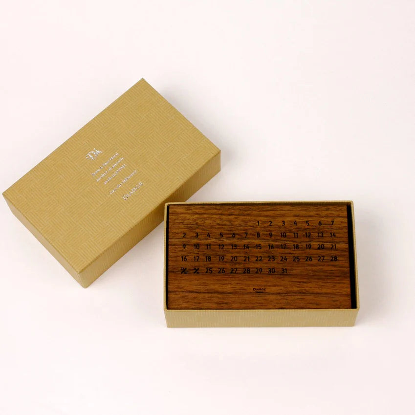 A product that functions as a calendar that can be used semi-permanently, has a presence as a desktop accessory, and allows you to enjoy the aging of brass and natural wood.