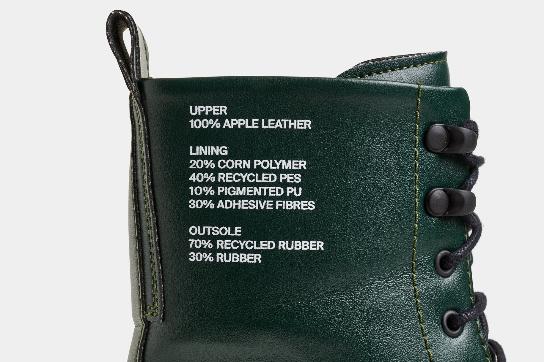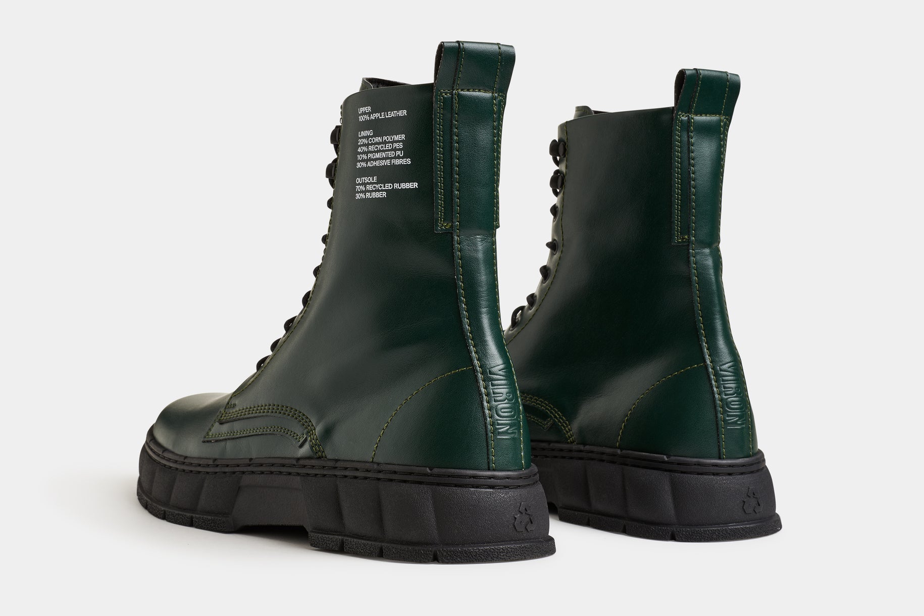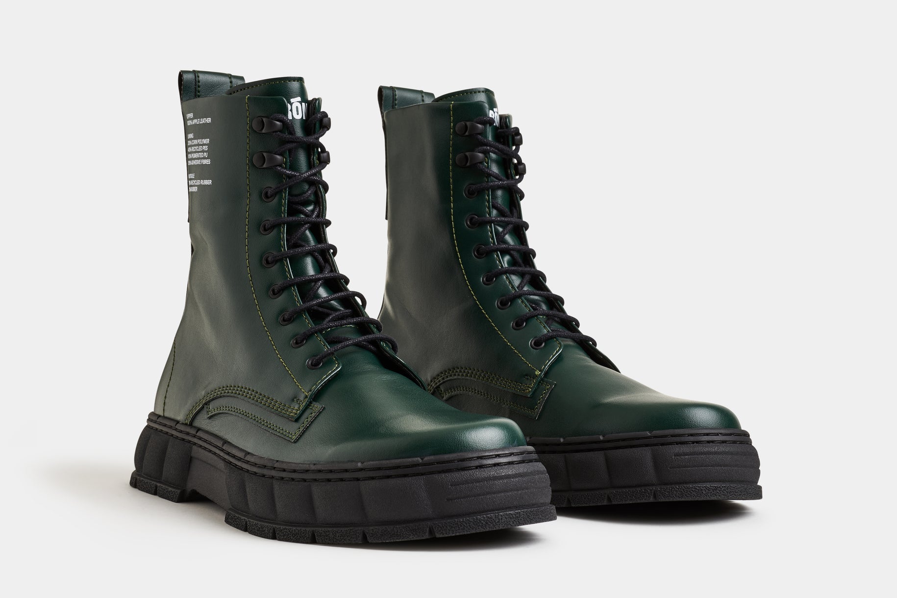ELEVATED COMBAT BOOTS WITH RAW-SEAMED CANVAS DETAILS. 100% APPLE SKIN - MADE FROM APPLE WASTE, GROWN FOR THE FOOD INDUSTRY, IN THE REGION OF BOLZANO, NORTHERN ITALY.