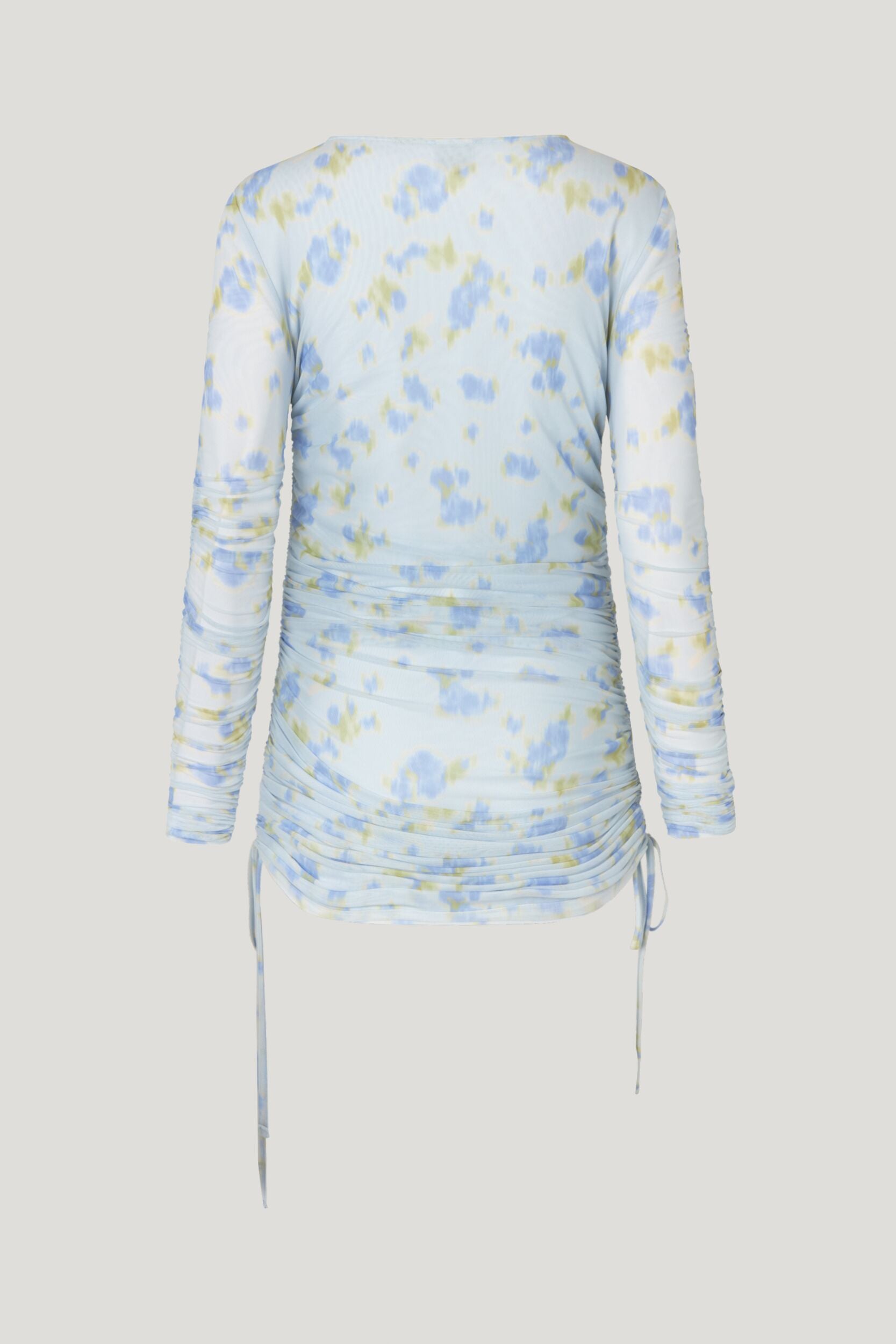 A knee-length dress with ruching at the sides and sleeves, as well as a drawstring at the hem. The dress is lined.