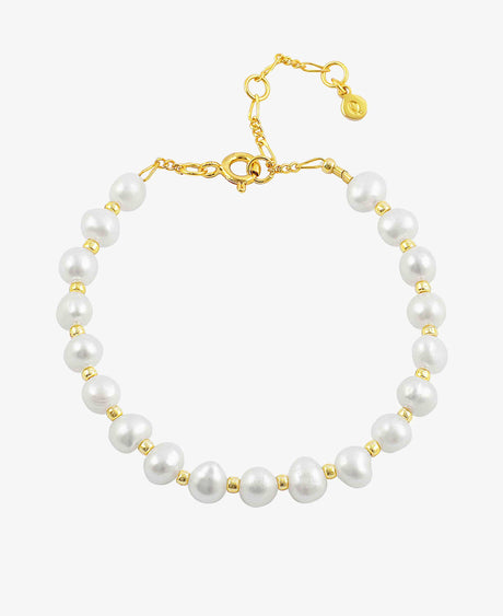 The Arabella bracelet is a classic pearl bracelet with small gold plated beads in between each pearl. It is simple and elegant, and combined with different bracelets it creates a chic look.