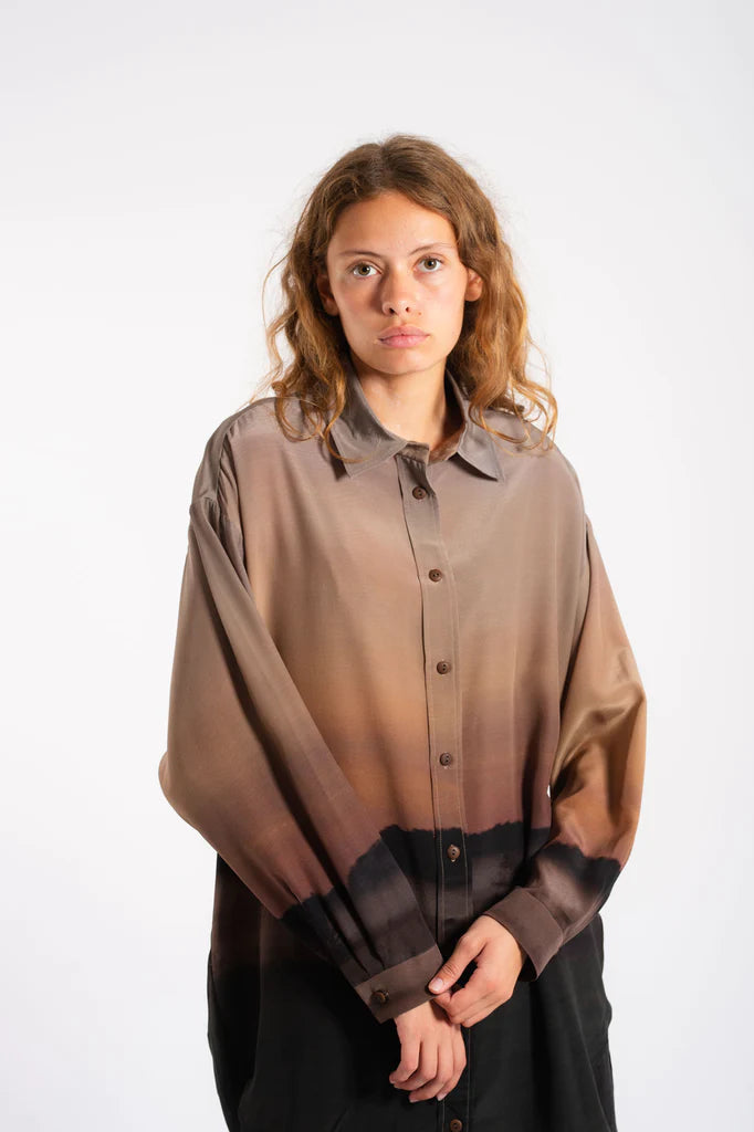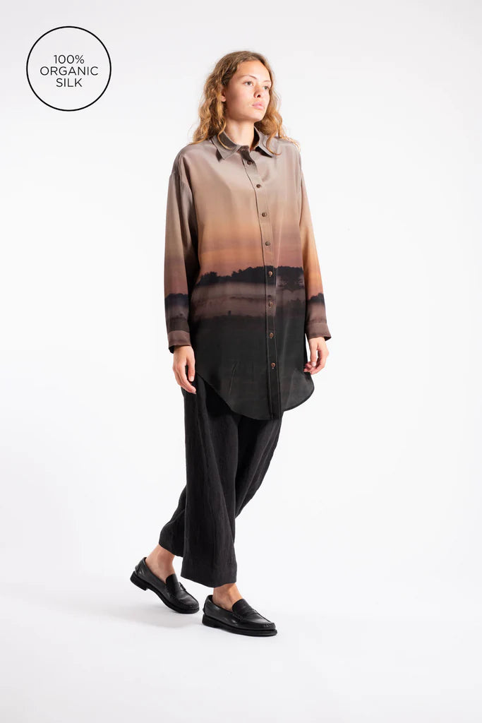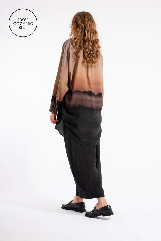 Relaxed-fit shirt made from organic silk, featuring the theme of our AW23 Collection - Rough Nights. Long sleeves with wide cuffs and a curved hemline, slightly longer in the back.