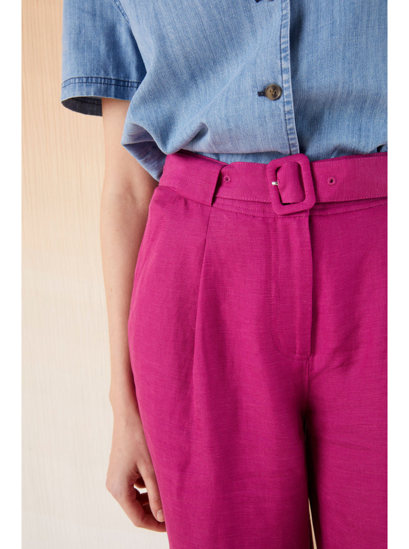 Wide and fluid pants, mid-rise waist. Small pleats marked below the belt, Italian pockets on each side and two patch pockets on the back. Loops, belt and belt buckle in the same material. Closes with a button and a zip.