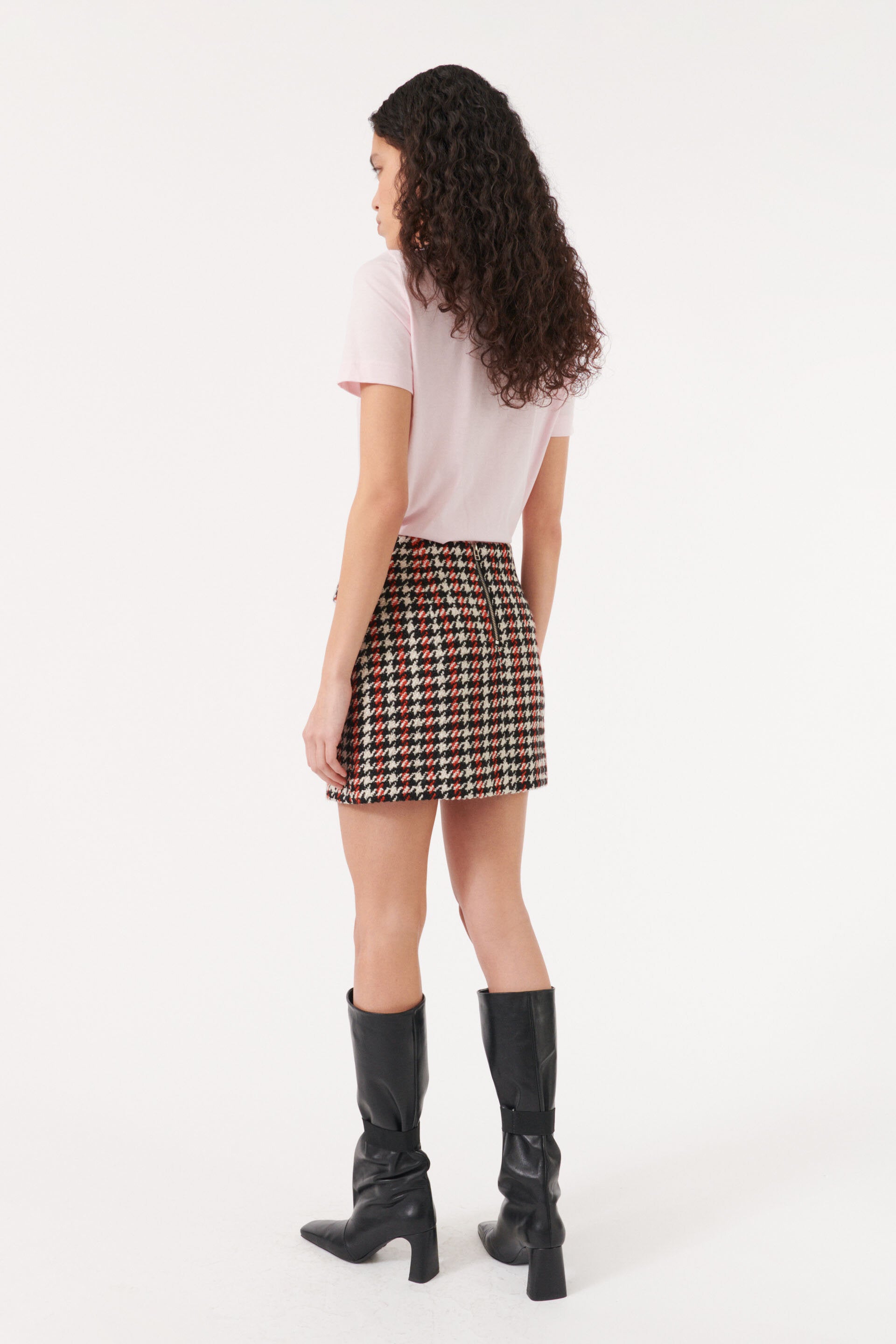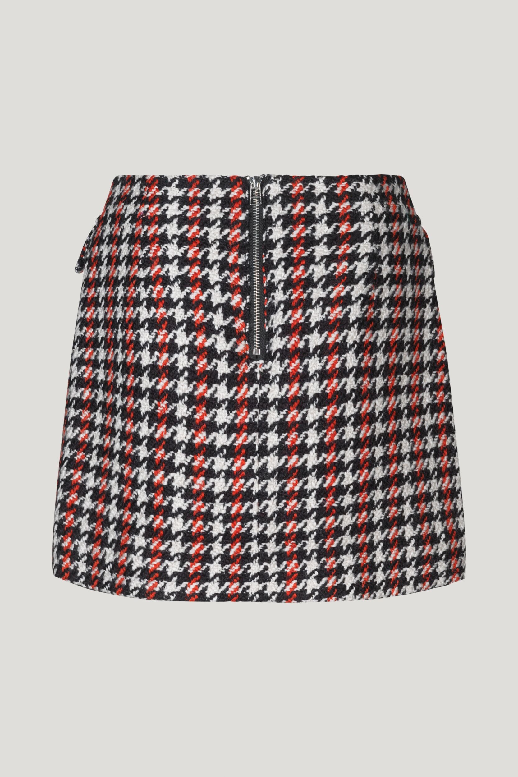 This classic bouclé miniskirt has patch pockets in the front, a zip closure in the back, and full lining.