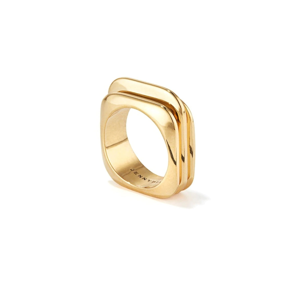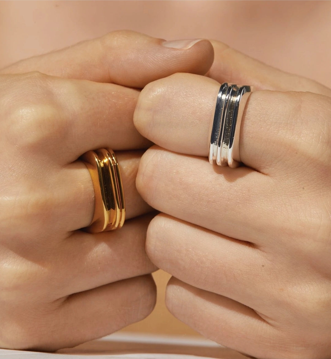 A solid, statement ring with plenty of texture and shine, boasting a levelled design element. Take typing and texting to new heights wearing this on its own or stacked up your other fave rings. Finished in high-polish gold.