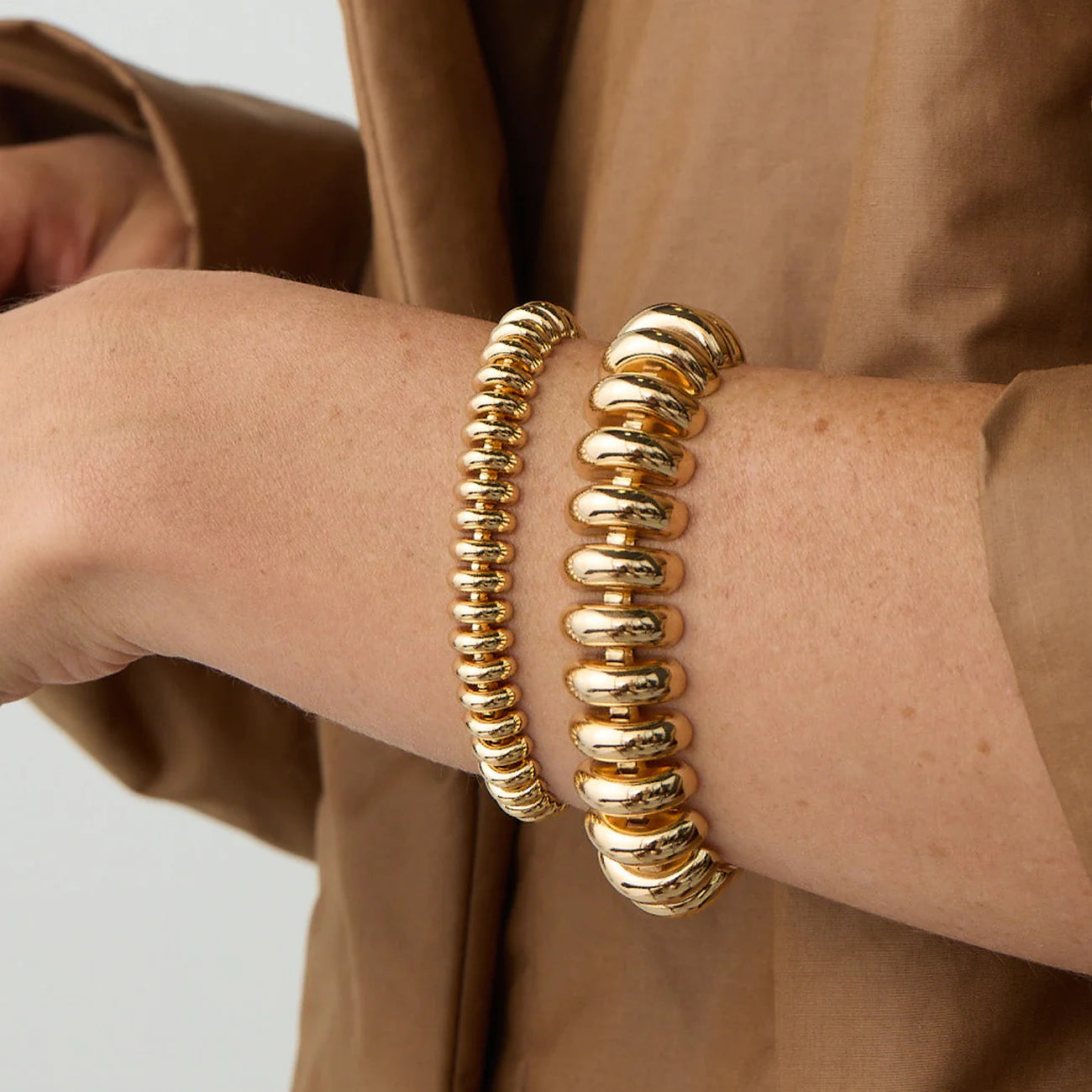 A gorgeously fluid bracelet that boasts a ribbed texture through a unique caterpillar construction. Vintage-inspired fold over closure, finished in high-polish gold.