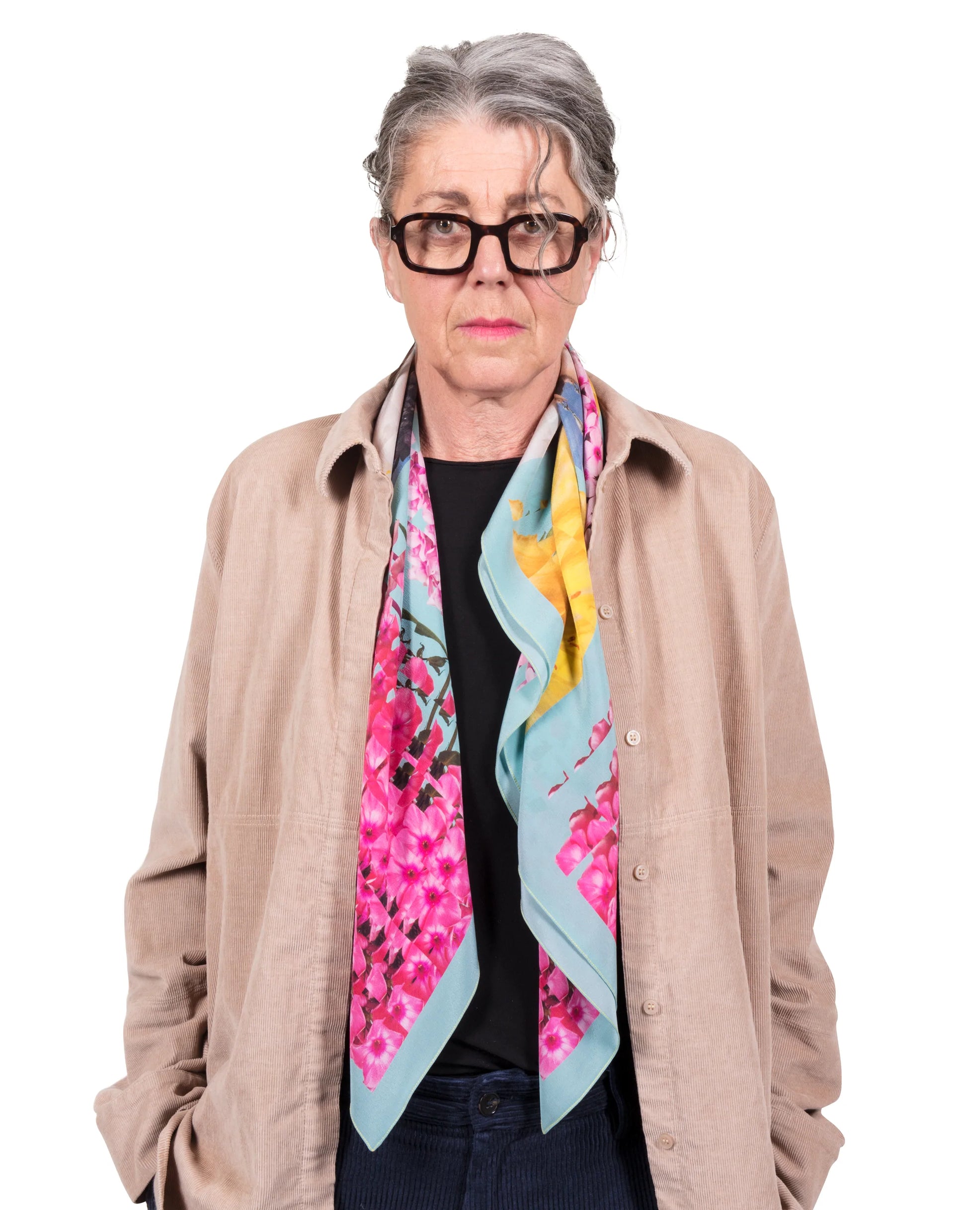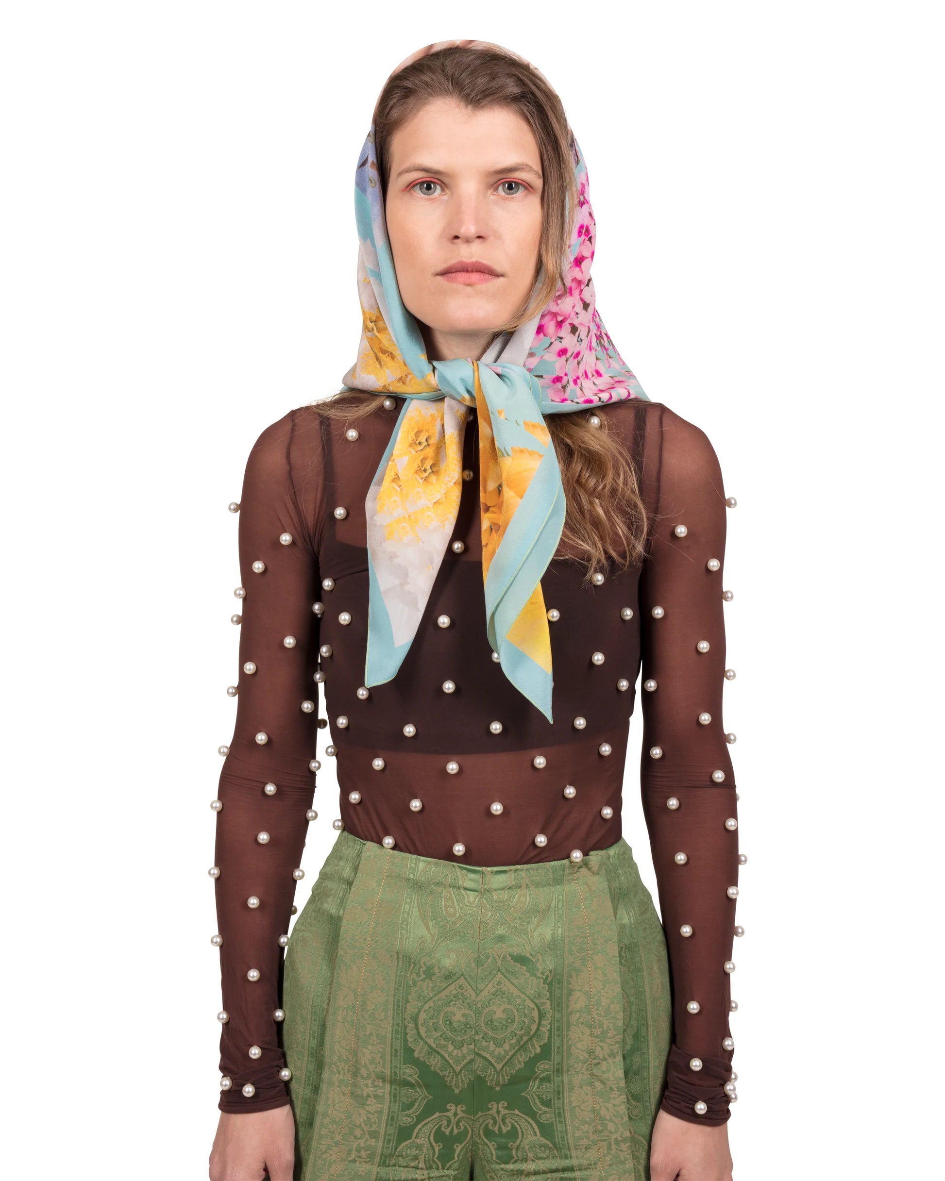 La Contessa (The Countess) is a limited edition scarf of 48 pieces, in a big square format, depicting Countess Clary und Aldringen surrounded by flowers with a faceted effect on a light blue background. Made in crêpe de chine silk with a contrasting yellow thread at the hem. This size format is extremely versatile, and can be used as a head or neck scarf, hijab or as a top.