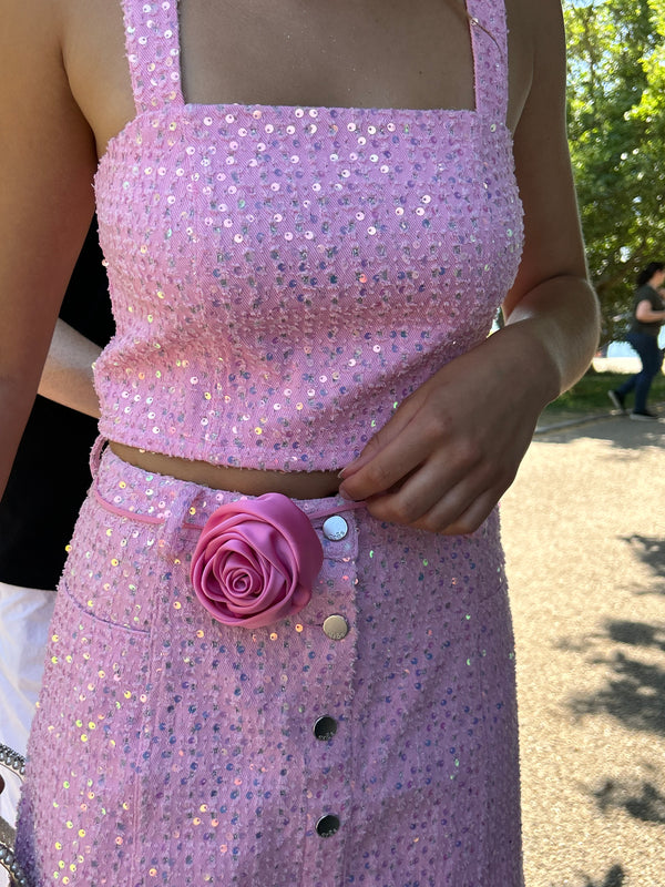 This season's most versatile fashion accessory! Use it as a belt, necklace or as decoration on any clothing item. The flower features a detachable leather string and both a clip and pin on the back side. Made from 100% polyester.