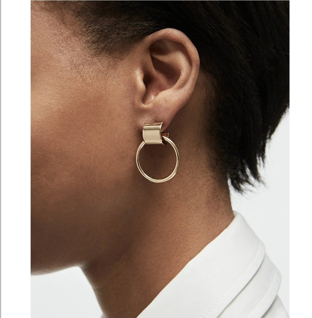 A lightweight hoop swings from a high polish earring huggie. Your essential for everyday.