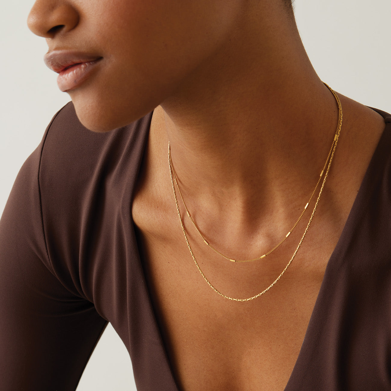 An elevated and chic 2-in-1 chain creates a trendy layered look in an instant, giving your outfit that perfect finishing touch. Trust us, you'll be reaching to wear this over and over. Shiny, three-dimensional rectangular elements are paced along an ultra comfortable curb chain, while the second layer boasts our shimmering intricate round chain. Our foldover clasp makes for easy closure.