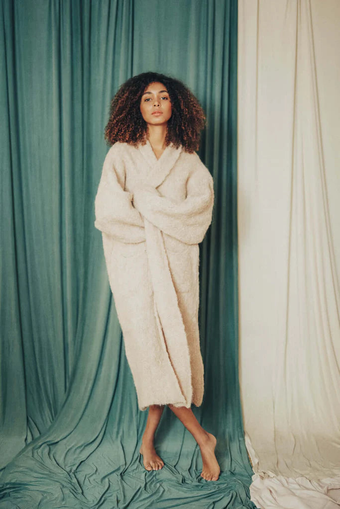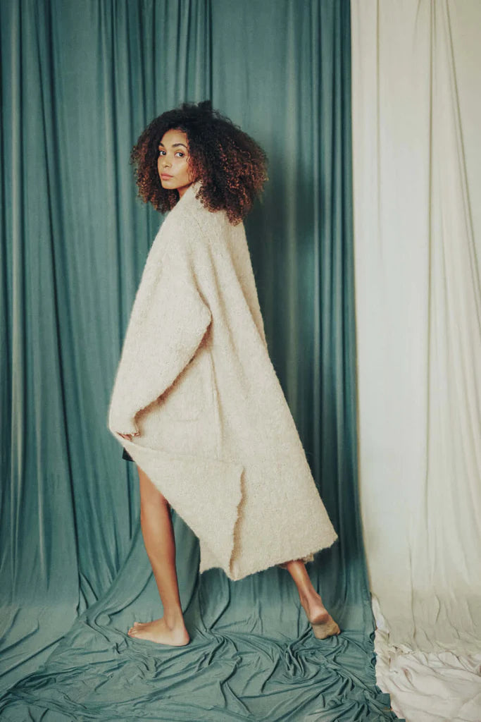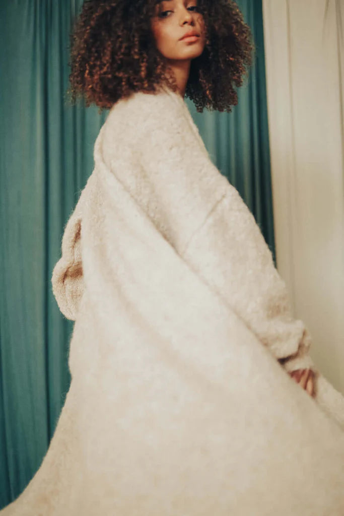 A beautiful chunky maxi cardigan crafted in undyed certified alpaca yarn. Can be worn indoors or outside as a coat. An excellent choice for both fashion and function, perfect for colder days. Keep cozy and enjoy the natural look & feel of alpaca wool.