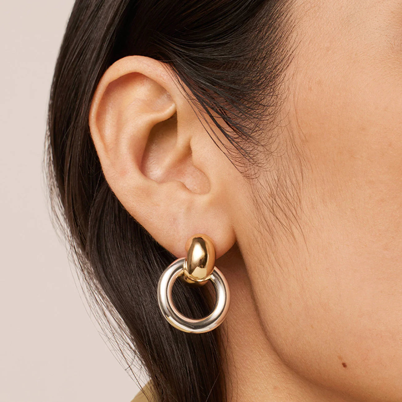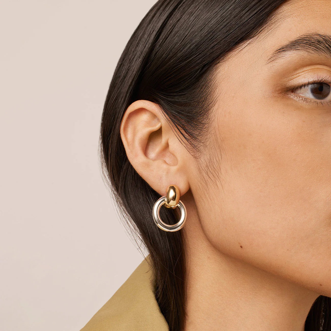 Coined by VOGUE Magazine as one of the best "minimalist earrings to wear now and forever", these puffy, high-shine hoops swing from a chubby huggie earring, creating beautiful movement as you wear them. The modern silhouette of these earrings brings something special to the everyday. Finished in high-polish gold and silver.