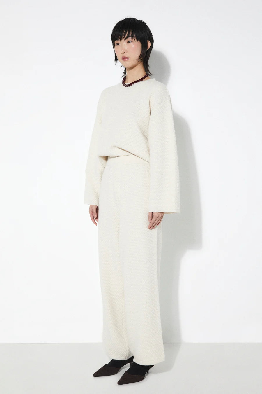 Textured knit loose-fitting ankle-length pants. High-waisted style with inset pockets on the sides and wide, flared legs. Adjustable elastic waistband.