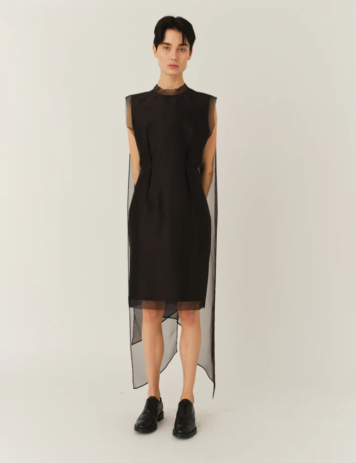 The Vivaldi Shift Dress with its midi-length is defined by its draped, flowing detailing on the back with a subtle, shiny surface and an additional zipper in the back.
