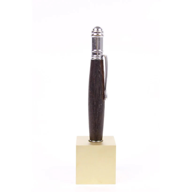 A product that cuts brass material into a 35mm cube and reversibly functions as a pen stand and a card stand. A 3WAY item that can also be used as a paperweight. A lineup of GOLD with a buffed finish and MAT GOLD with a sandblast finish.
