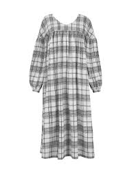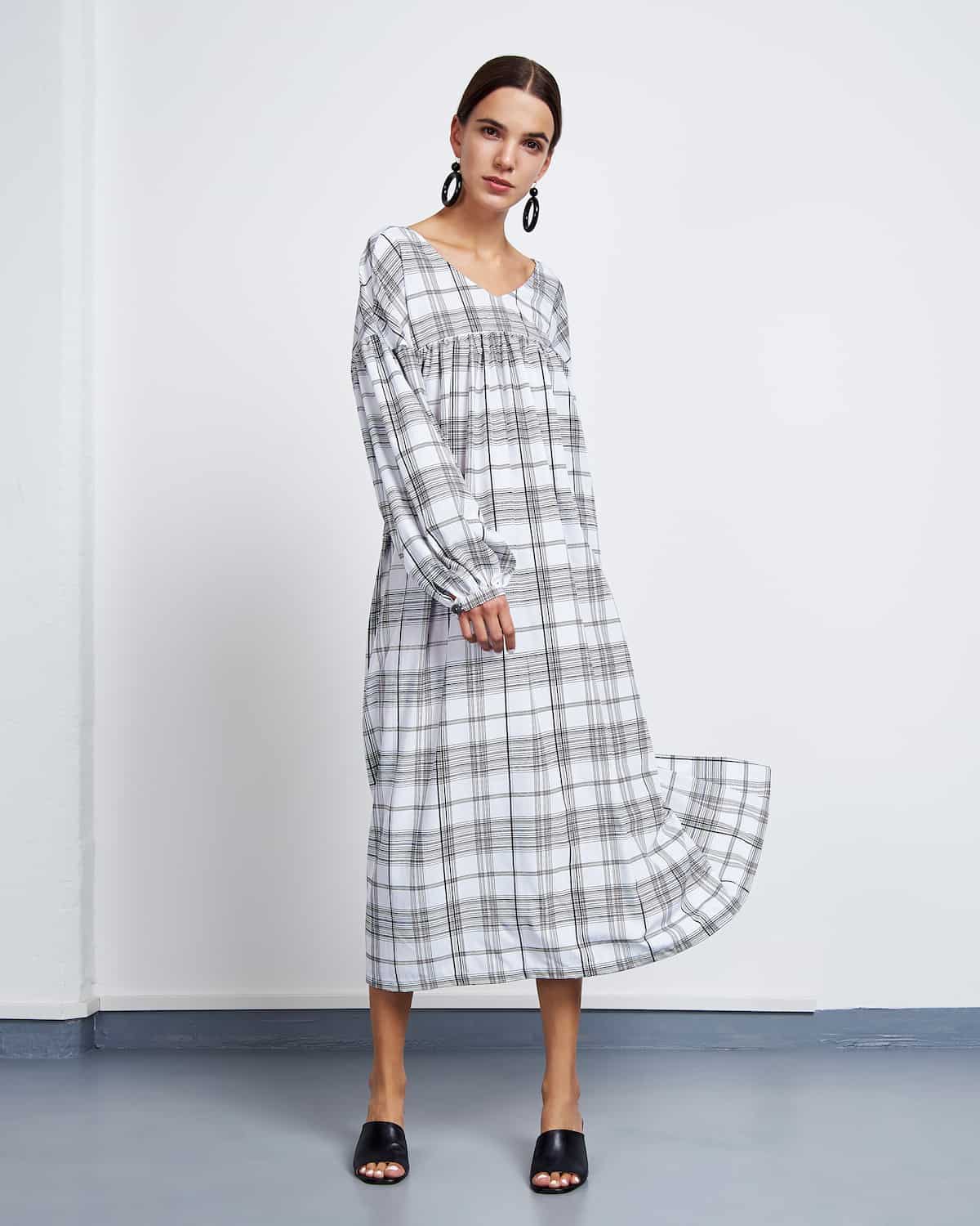 Wide sleeves, wide fit, maxi length, and checkered. The fabric feels silky and light on your skin and is made out of 100% recycled PET waste.