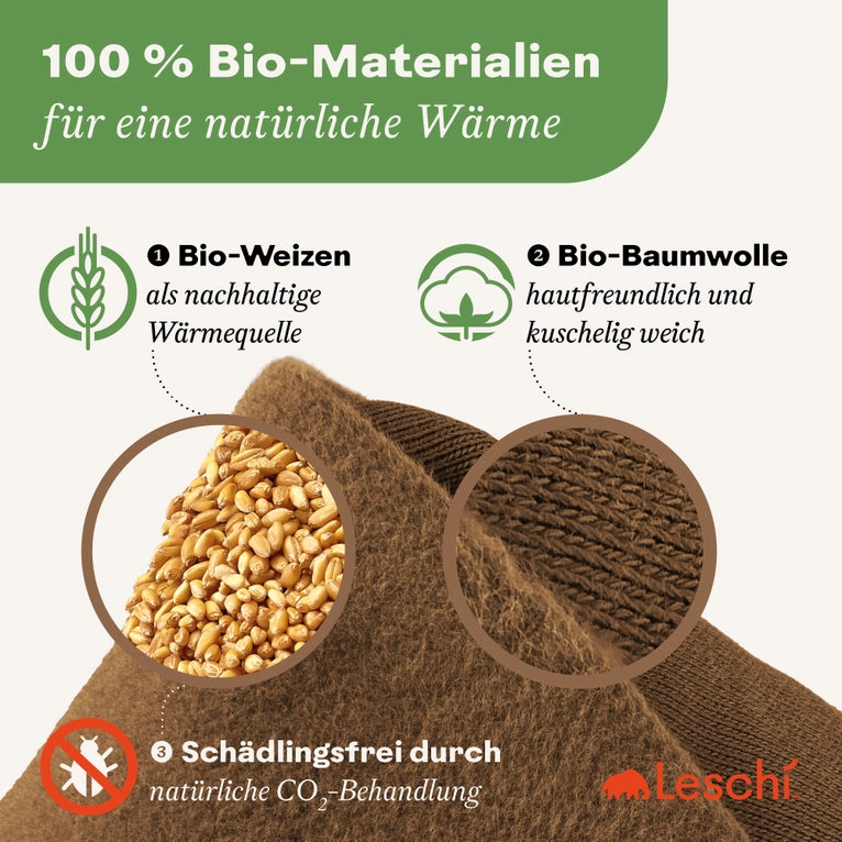NATURAL MATERIALS: ORGANIC COTTON & ORGANIC WHEAT Cover made of 100% organic cotton and filled with 100% organic wheat from a German mill – soft, sustainable, and with even warmth.