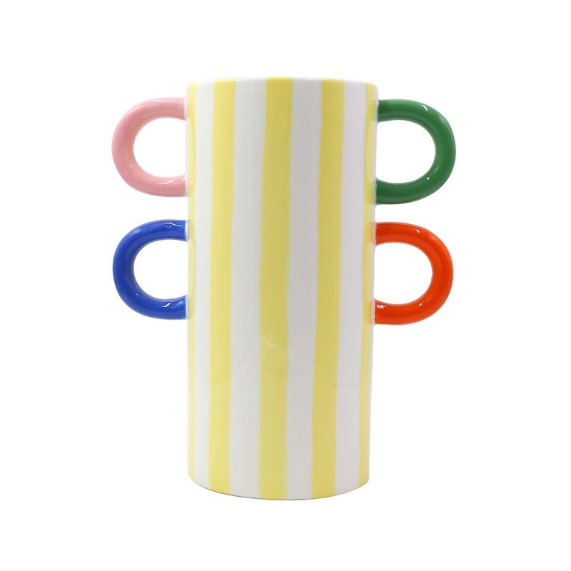 Enhance your floral display with the ceramic Elisa vase from Qué Rico. This Belgian-designed vase, inspired by the lively Spanish lifestyle and featuring the colorful Rayas Bailarinas pattern, adds a ray of sunshine to your home. With its organic shape and vibrant color combination of yellow and white, along with its handles in fun bold colors, this handmade vase is a true eye-catcher in any interior. As it is hand-painted, every piece is unique!