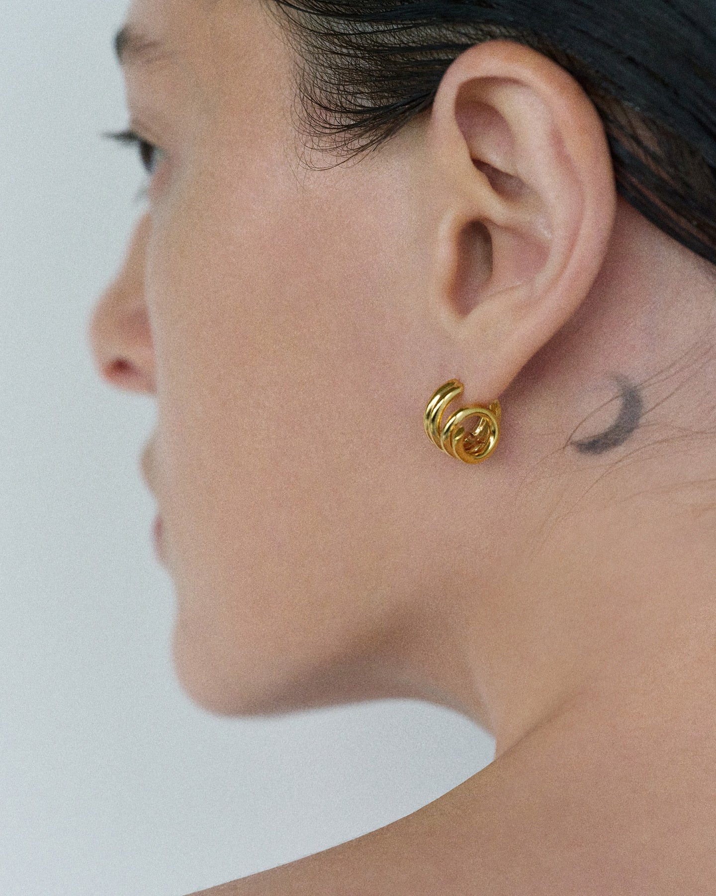 This is a coil earring that falls diagonally. This product clearly shows the shape and volume of the three-dimensional wound coil when worn.