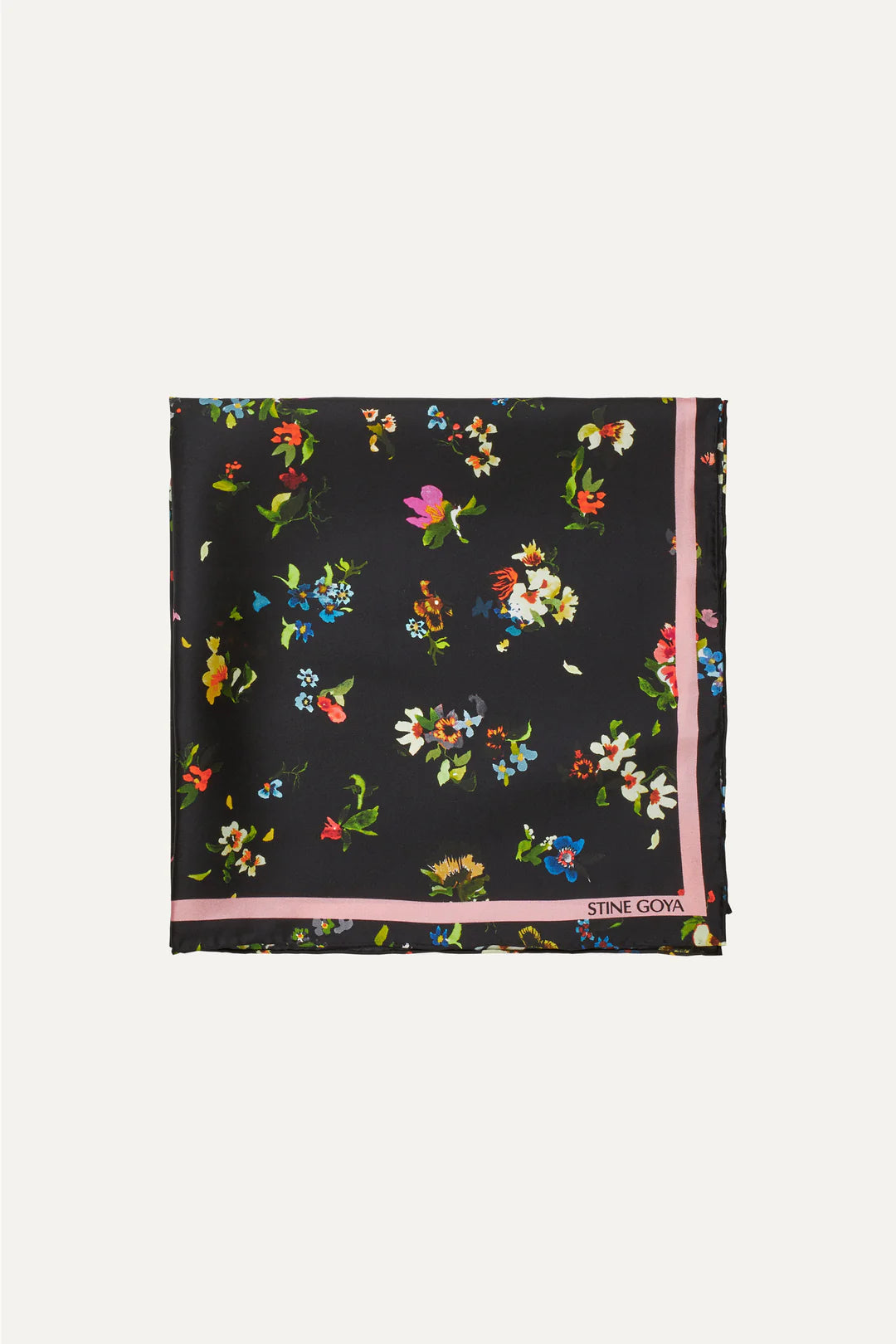 SQUARE SCARF MADE FROM 100% SILK FEATURING A DELICATE ALL-OVER FLORAL PRINT ON A BLACK BACKGROUND. FINISHED WITH A SOFT PINK BORDER AND A SUBTLE STINE GOYA LOGO IN THE CORNER. A LIGHT AND VERSATILE ACCESSORY TO WEAR AROUND THE NECK, IN THE HAIR, OR TIED TO A BAG.